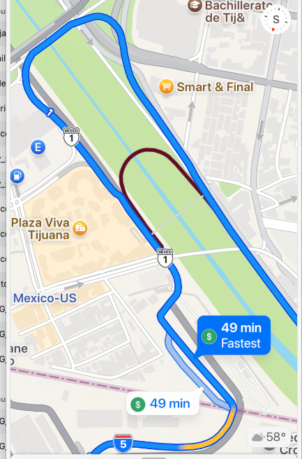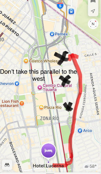 Crossing the border South – As of Dec 2025 there was major construction along the east west border road which resulted in the first right after crossing the border being closed. Here is how to access it. The normal immediate right shortcut exit is closed (brown in image). Take the first offramp on the LEFT which goes up and away from where you want to go. (don’t stay on the straight route down low). Instead parallel the low gray road after exiting and cross right over the river and right again so you head you north again. This will put you on the border road which will force an immediate left turn to head west.